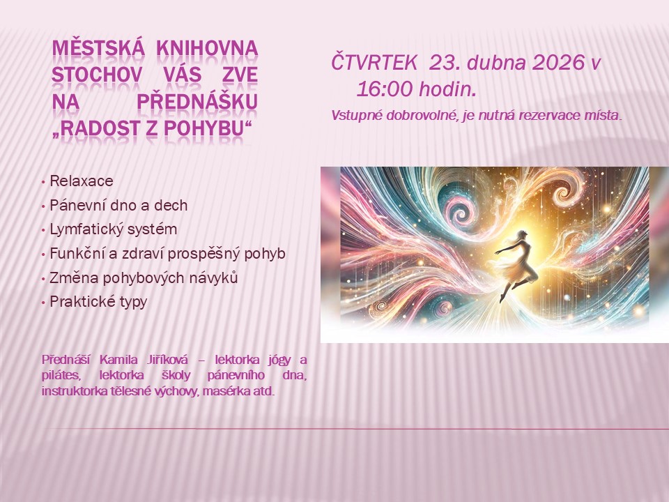 Přijďte si poslechnout přednášku Kamily Jiříkové ve čtvrtek 23. dubna v 16.00 hodin. Dozvíte se mnoho zajímavých informací o lymfatickém systému,relaxaci a o funkčním a zdraví prospěšném pohybu.